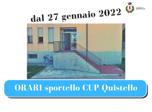 Si comunica che a partire da govedì 27 gennaio 2022 lo sportello Cup di Quistello all'interno della struttura ambulatoriale (ex Ospedale) sarà aperto oltre che il martedì anche il giovedì.