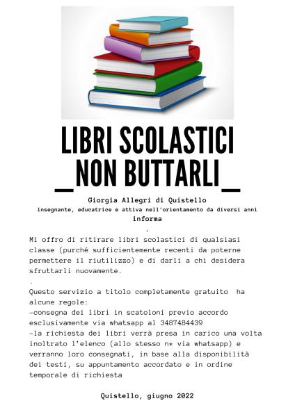 Come ogni anno l'insegnante si offre di ritirare libri scolastici di qualsiasi classe (purché sufficientemente recenti da poterne permettere il riutilizzo) e di darli a chi desidera sfruttarli nuovamente.
